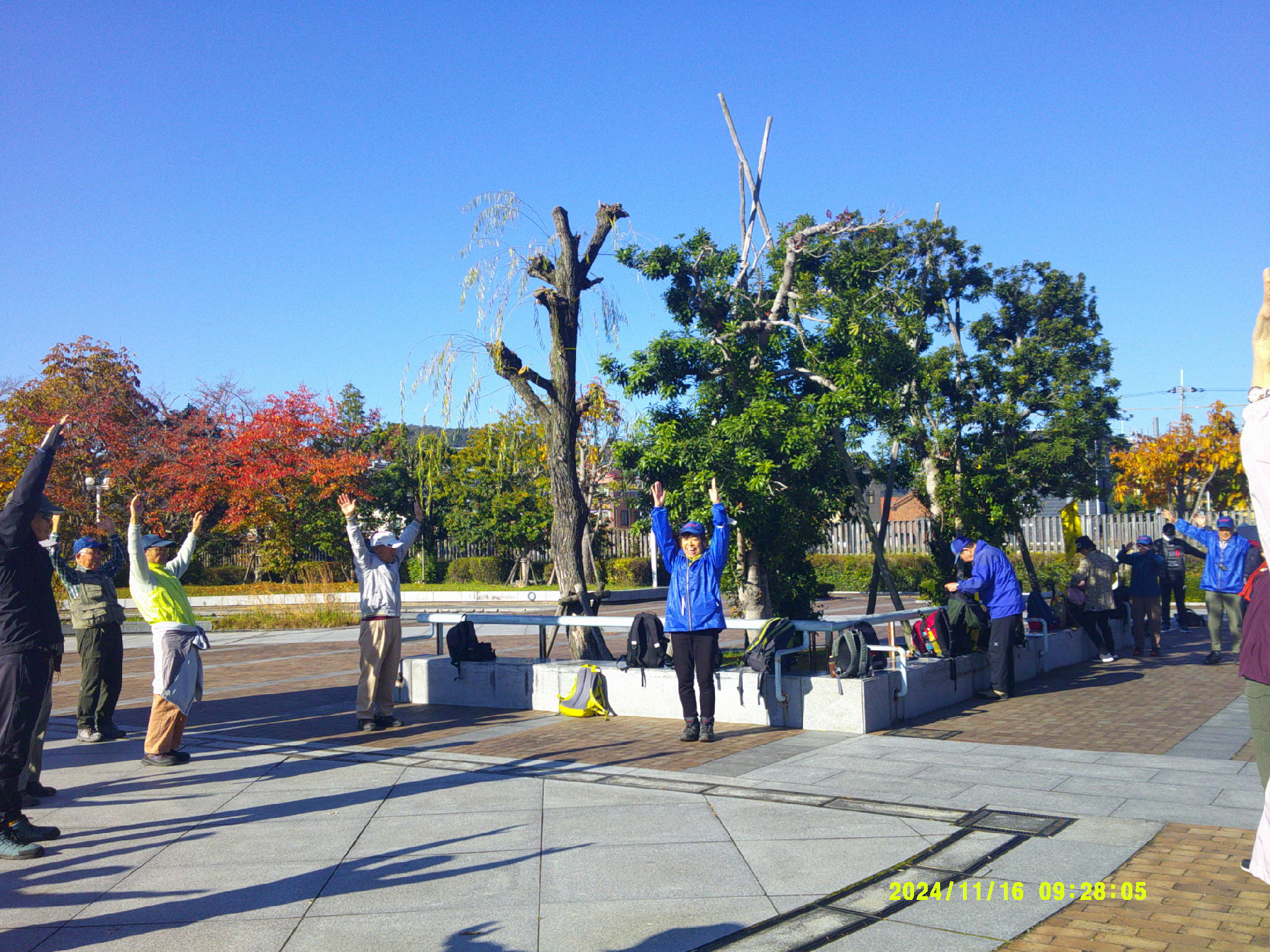 【JR加茂駅前の広場で準備運動(今日の参加者は54名)】