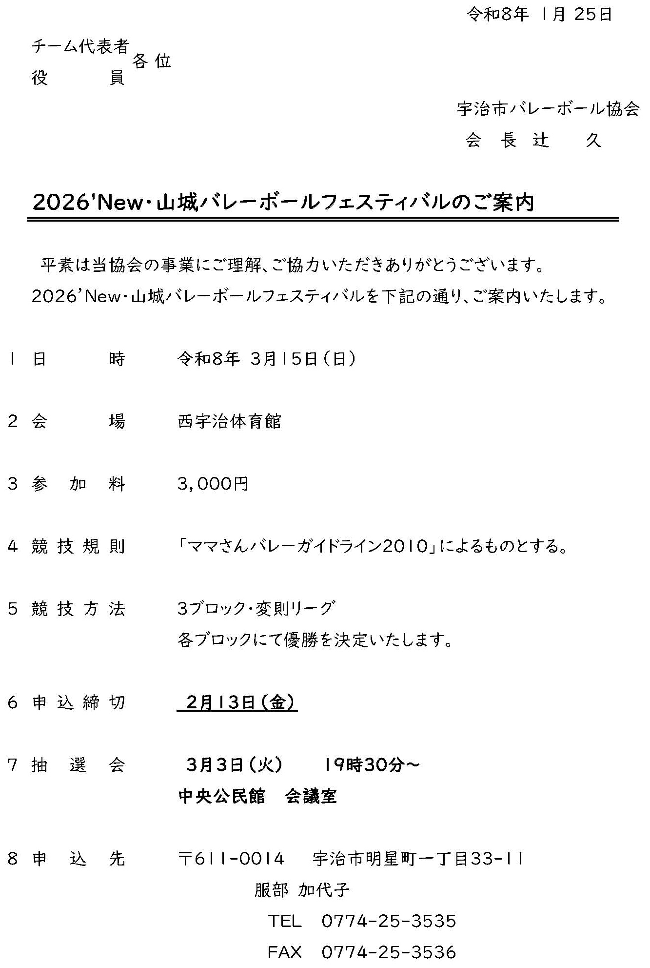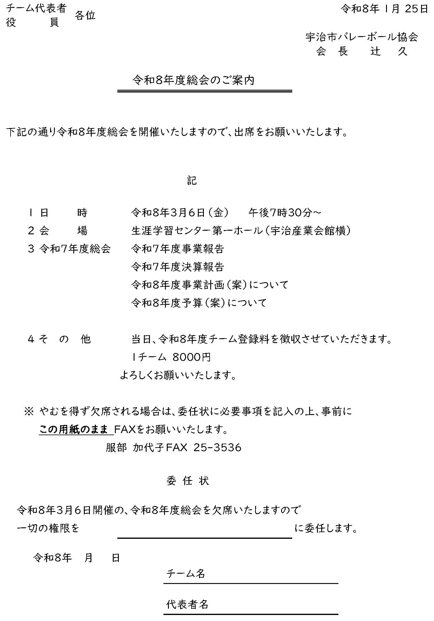 「令和8年度宇治市バレーボール協会(家庭婦人部会)加盟登録について」